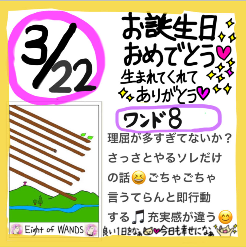 皆さま、こんにちは!プリンセスケイコ〜です😃 今日の気分はいかがですか?😊 3月22日お誕生日の皆さま… お誕生日おめでとう🎂🥰💐🎊㊗️🎉 生まれてくれて本当にありがとう🥳 今日のタロットメッセージ 今日のカード ワンド8 理屈が多すぎてないか? さ... -