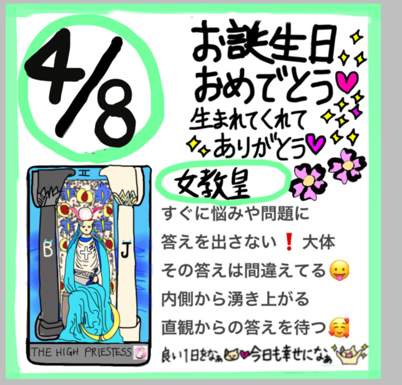 皆さま、こんにちは!プリンセスケイコ〜です😃 今日の気分はいかがですか?😊 4月8日お誕生日の皆さま… お誕生日おめでとう🎂🥰💐🎊㊗️🎉 生まれてくれて本当にありがとう🥳 今日のタロットメッセージ 今日のカード 女教皇 すぐに悩みや問題に答えを出さ... -