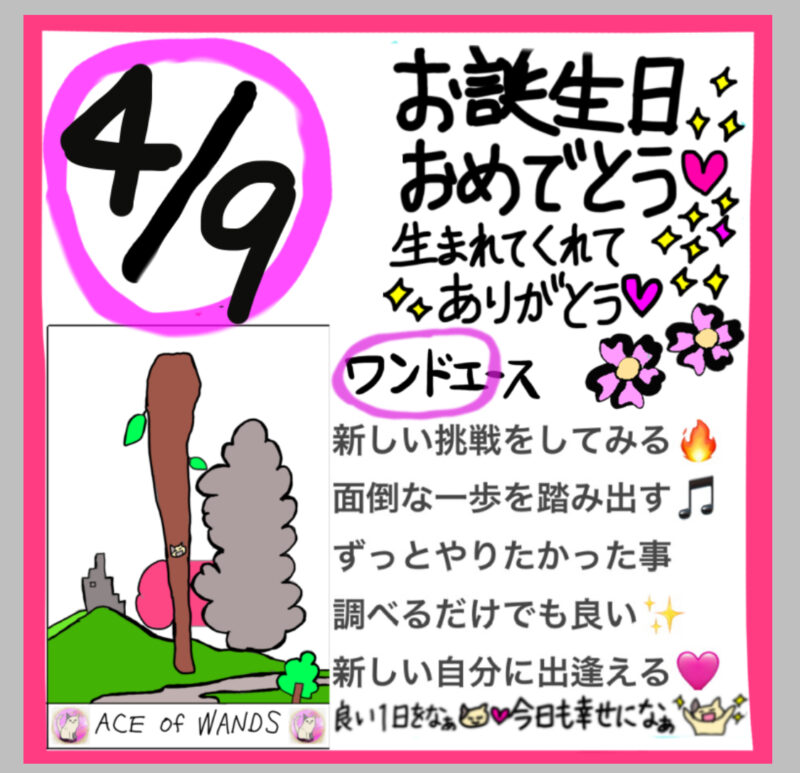 皆さま、こんにちは!プリンセスケイコ〜です😃 今日の気分はいかがですか?😊 4月9日お誕生日の皆さま… お誕生日おめでとう🎂🥰💐🎊㊗️🎉 生まれてくれて本当にありがとう🥳 今日のタロットメッセージ 今日のカード ワンドエース🔥 新しい挑戦をし... -
