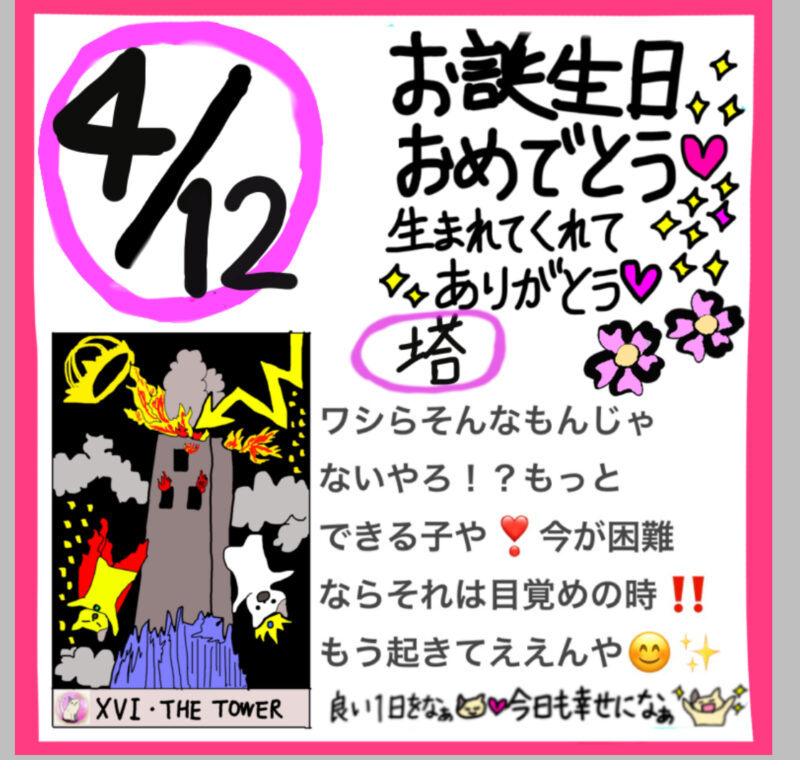 皆さま、こんにちは!プリンセスケイコ〜です😃 今日の気分はいかがですか?😊 4月12日お誕生日の皆さま… お誕生日おめでとう🎂🥰💐🎊㊗️🎉 生まれてくれて本当にありがとう🥳 今日のタロットメッセージ 今日のカード 塔 ワシらそんなもんじゃ ない... -