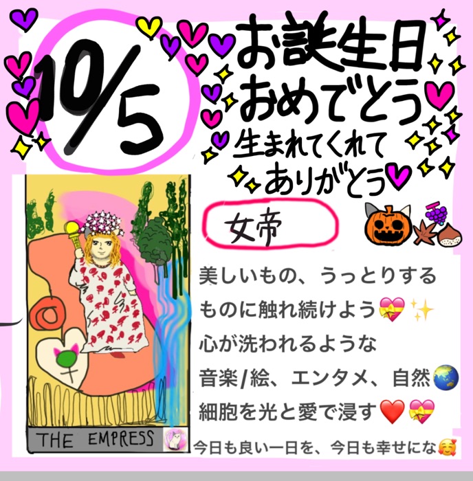 皆さま、こんにちは!ひときもです😃 今日の気分はいかがですか?😊 10月5日お誕生日の皆さま… お誕生日おめでとう🎂🥰💐🎊㊗️🎉 生まれてくれて本当にありがとう🥳 今日のタロットメッセージ 今日のカード 女帝 美しいもの、うっとりする ものに触れ続けよ...