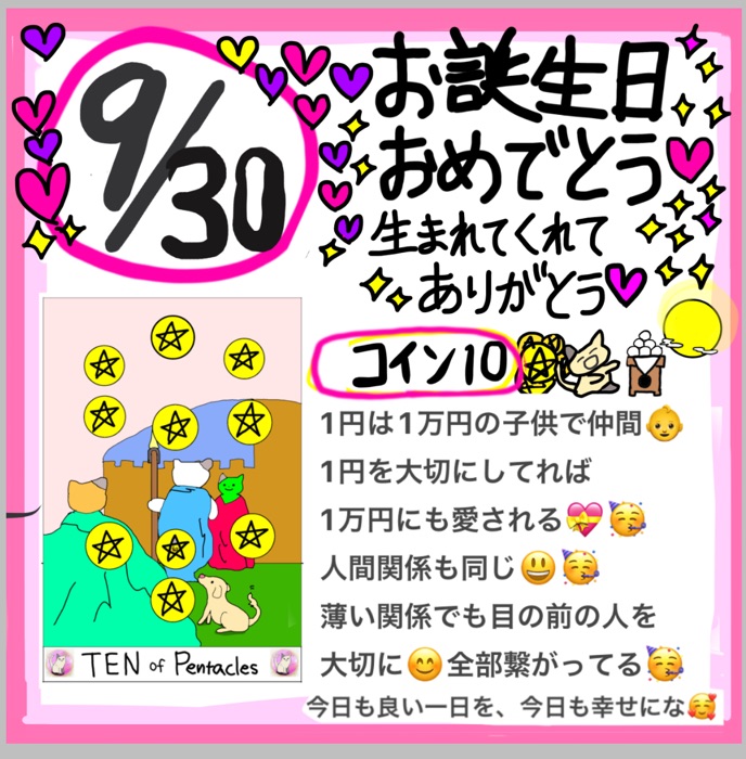 皆さま、こんにちは!ひときもです😃 今日の気分はいかがですか?😊 9月30日お誕生日の皆さま… お誕生日おめでとう🎂🥰💐🎊㊗️🎉 生まれてくれて本当にありがとう🥳 今日のタロットメッセージ 今日のカード コイン10 1円は1万円の子供で仲間👶 1円を大切にし...