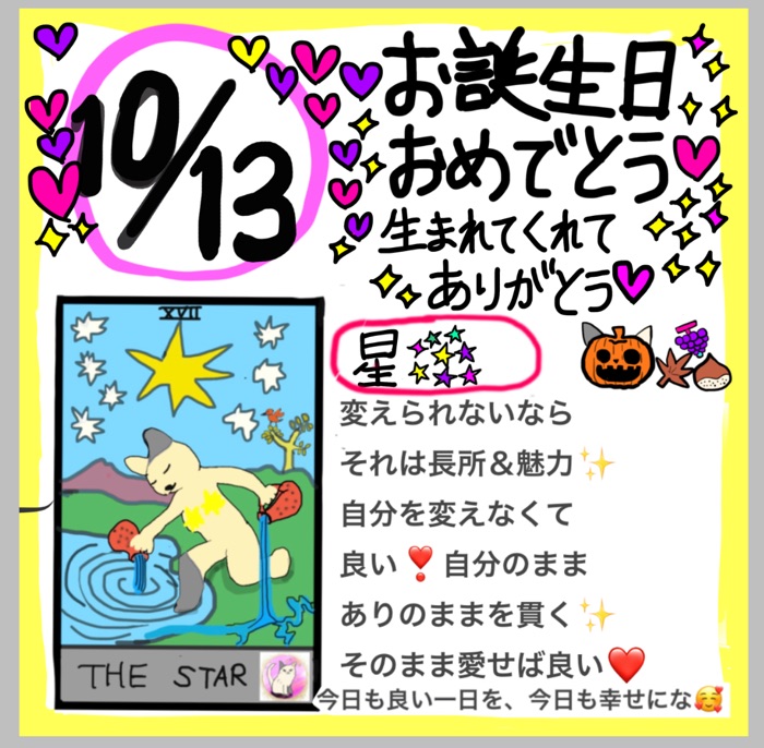 皆さま、こんにちは!ひときもです😃 今日の気分はいかがですか?😊 10月13日お誕生日の皆さま… お誕生日おめでとう🎂🥰💐🎊㊗️🎉 生まれてくれて本当にありがとう🥳 今日のタロットメッセージ 今日のカード 星✨ 変えられないなら それは長所&魅力✨ 自分を...